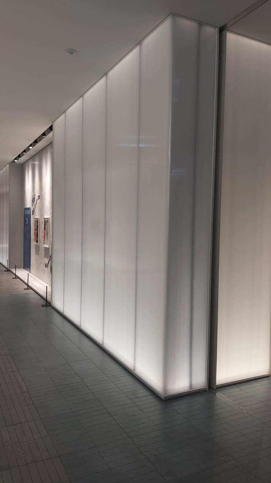 採取輕隔間工法,PC中空板因為散光背板因素可以有效遮蔽背結構影像(間距100mm),搭配上下LED光條,因為背面散光結構層可以導光線均勻擴散到整面光牆。且LED燈可以變換色彩,有節能,易安裝,免維修優勢。